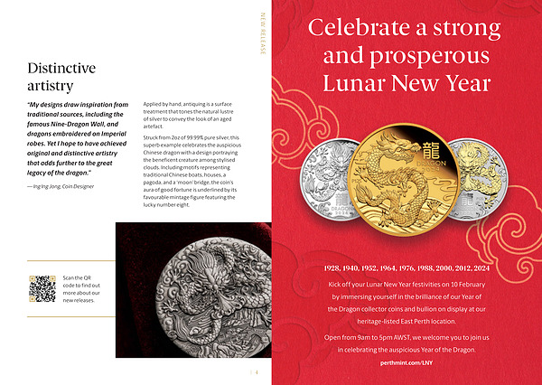 Struck from 2oz of 99.99 % pure silver , this superb example celebrates the auspicious Chinese dragon with a design portraying the beneficent creature among stylised clouds . Including motifs representing traditional Chinese boats , houses , a pagoda , and a ‘ moon ’ bridge , the coin ’ s aura of good fortune is underlined by its favourable mintage figure featuring the lucky number eight .