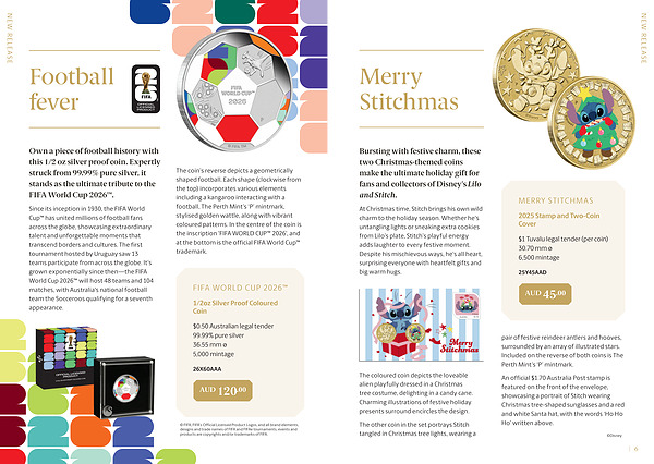 The coin’ s reverse depicts a geometrically shaped football. Each shape( clockwise from the top) incorporates various elements including a kangaroo interacting with a football, The Perth Mint’ s‘ P’ mintmark, stylised golden wattle, along with vibrant coloured patterns. In the centre of the coin is the inscription ' FIFA WORLD CUP™ 2026 ', and at the bottom is the official FIFA World Cup™ trademark.