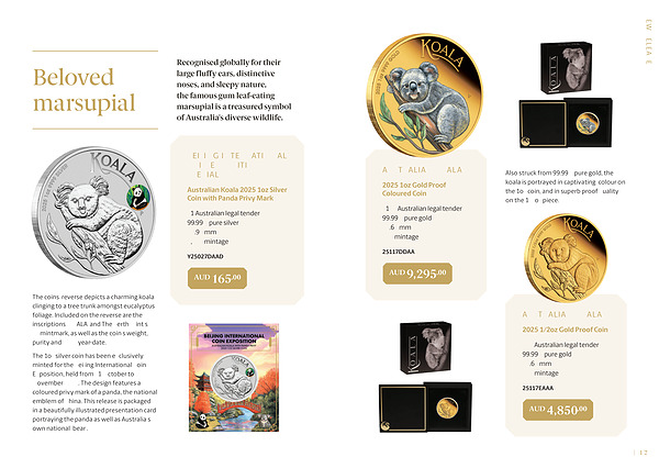 The coins ' reverse depicts a charming koala clinging to a tree trunk amongst eucalyptus foliage. Included on the reverse are the inscriptions‘ KOALA’ and The Perth Mint’ s‘ P’ mintmark, as well as the coin’ s weight, purity and 2025 year-date.