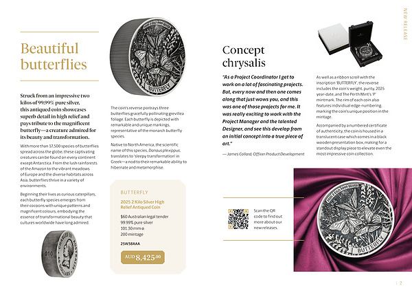 As well as a ribbon scroll with the inscription‘ BUTTERFLY’, the reverse includes the coin’ s weight, purity, 2025 year-date, and The Perth Mint’ s‘ P’ mintmark. The rim of each coin also features individiual edge-numbering, marking the coin ' s unique position in the mintage.