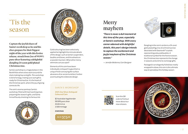 Capture the joyful chaos of Santa ' s workshop as he and his elves prepare for their biggest night of the year with this festive release, struck from 2oz of 99.99 % pure silver featuring a delightful dangling 24-carat gold-plated Christmas tree.