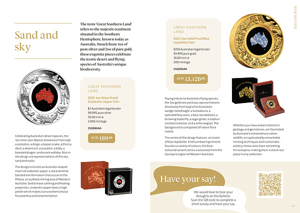 The term ' Great Southern Land ' refers to the majestic continent situated in the Southern Hemisphere, known today as Australia. Struck from 1oz of pure silver and 2oz of pure gold, these exquisite pieces celebrate the iconic desert and flying species of Australia ' s unique biodiversity.
