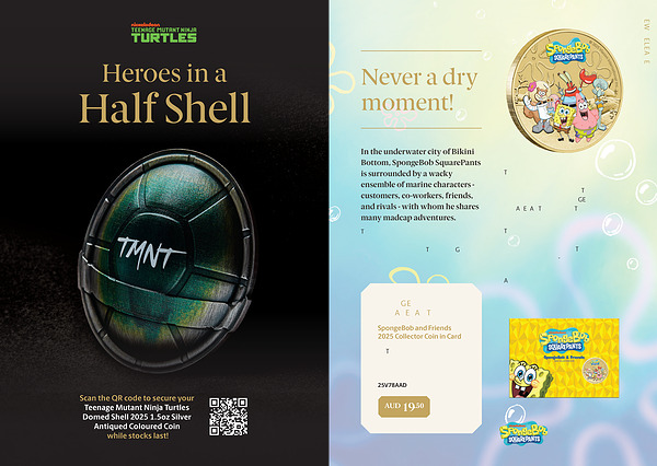 The coin’ s reverse portrays SpongeBob SquarePants and his friends including Patrick Star, Squidward Tentacles, Gary, Sandy Cheek, Mr Krabs and Sheldon J. Plankton, all depicted in full colour.