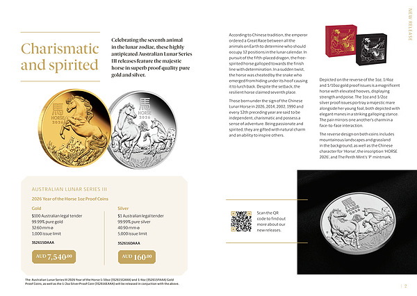 The reverse design on both coins includes mountainous landscapes and grassland in the background, as well as the Chinese character for‘ Horse’, the inscription‘ HORSE 2026’, and The Perth Mint’ s‘ P’ mintmark.