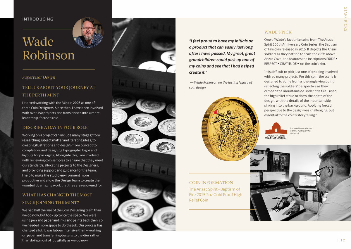 One of Wade ' s favourite coins from The Anzac Spirit 100th Anniversary Coin Series, the Baptism of Fire coin released in 2015. It depicts the Anzac soldiers as they battled to scale the cliffs above Anzac Cove, and features the inscriptions PRIDE • RESPECT • GRATITUDE •' on the coin ' s rim.