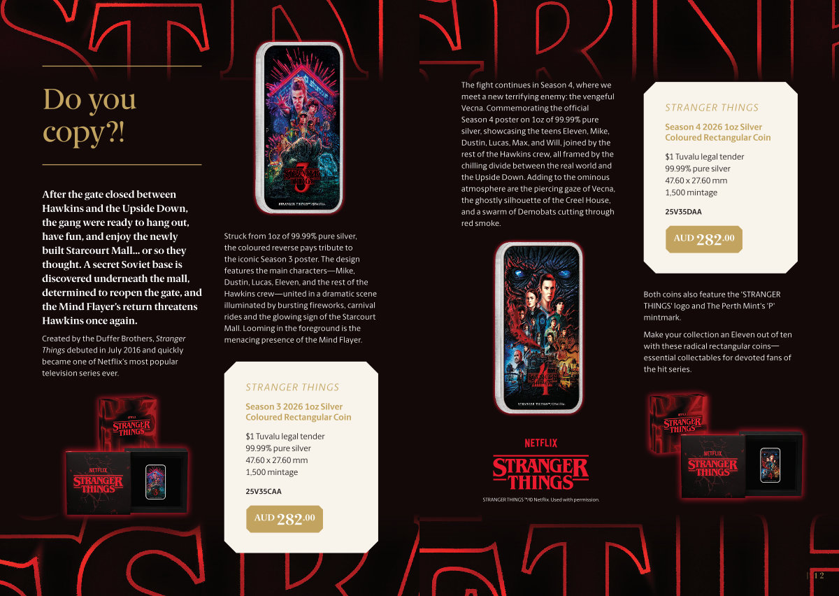 Struck from 1oz of 99.99 % pure silver, the coloured reverse pays tribute to the iconic Season 3 poster. The design features the main characters— Mike, Dustin, Lucas, Eleven, and the rest of the Hawkins crew— united in a dramatic scene illuminated by bursting fireworks, carnival rides and the glowing sign of the Starcourt Mall. Looming in the foreground is the menacing presence of the Mind Flayer.