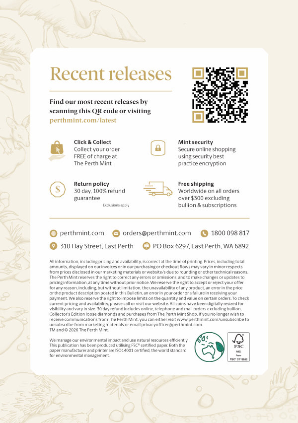 All information, including pricing and availability, is correct at the time of printing. Prices, including total amounts, displayed on our invoices or in our purchasing or checkout flows may vary in minor respects from prices disclosed in our marketing materials or website / s due to rounding or other technical reasons. The Perth Mint reserves the right to correct any errors or omissions, and to make changes or updates to pricing information, at any time without prior notice. We reserve the right to accept or reject your offer for any reason, including, but without limitation, the unavailability of any product, an error in the price or the product description posted in this Bulletin, an error in your order or a failure in receiving your payment. We also reserve the right to impose limits on the quantity and value on certain orders. To check current pricing and availability, please call or visit our website. All coins have been digitally resized for visibility and vary in size. 30 day refund includes online, telephone and mail orders excluding bullion, Collector’ s Edition loose diamonds and purchases from The Perth Mint Shop. If you no longer wish to receive communications from The Perth Mint, you can either visit www. perthmint. com / unsubscribe to unsubscribe from marketing materials or email privacyofficer @ perthmint. com. TM and © 2026 The Perth Mint.